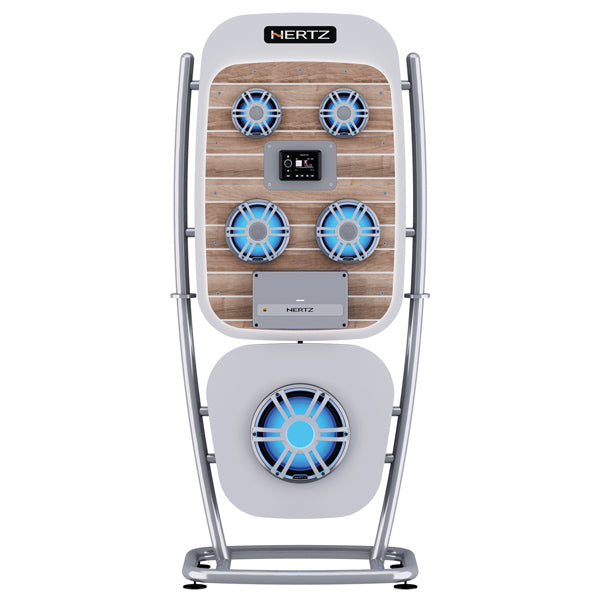 Hertz produktdisplay med följande produkter:\n1114760 Hertz Capri H100 DAB+ radio\n1114795 Hertz HM RGB1 BK styrenhet m/fjärrkontroll\n1114794 Hertz Venezia V5C marinförstärkare - 5 kanaler 4x115W+1x550\n1114785 Hertz HMX 6.5 S-LD-SW-6.5”4Ohm marinhögtalare, sportRGB\n1114796 Hertz HMX 8 S-LD-G-8”4Ohm sports koax rgb led set\n1114791 Hertz HMS 10 S2-LD-SW marin subwoofer\n1114797 Hertz S8 DSP - HI RES digital signalprocessor