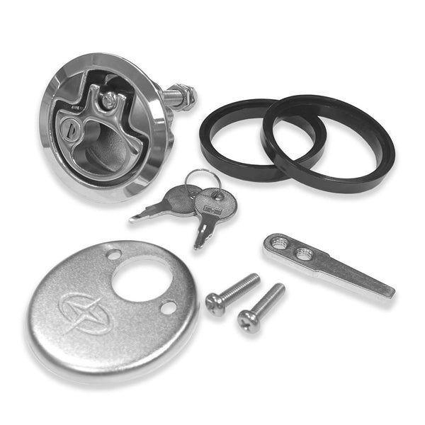 För användning på alla typer av däcksluckor, från en liten ankarlåda till en stor maskinrumslucka. Detta låsbara kompressionsbeslag är tillverkat i blankpolerat 316 rostfritt stål. Det fjäderbelastade handtaget ger 4 mm kompression vid nedfällning så att luckan blir vattentätt och vibrationsfri. För att undvika skador så kan man fälla ned handtaget när beslaget är öppet.\n\nLucklåset levereras i ett komplett kit med:\n· Distanser för olika paneltjocklekar\n· En regel med två hål för maximal monteringsflexibilitet\n· Ett bakstycke\n· Två nycklar för låsmekanismen\n\nInstallationen är mycket enkel, du behöver bara göra ett enda hål.