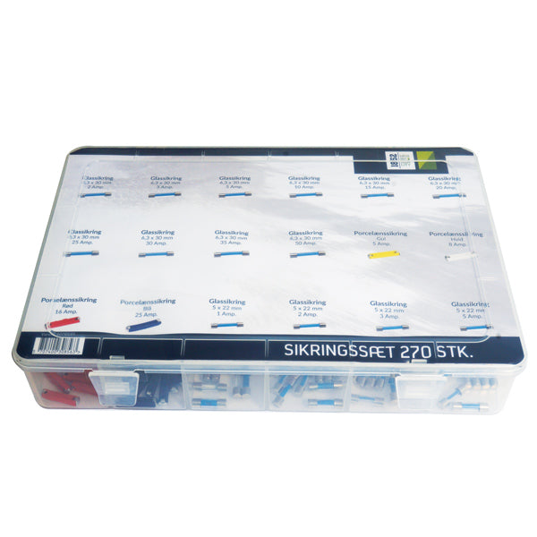 270 st glas- och porslinssäkringer i plastbox från 2 till 50 amp.