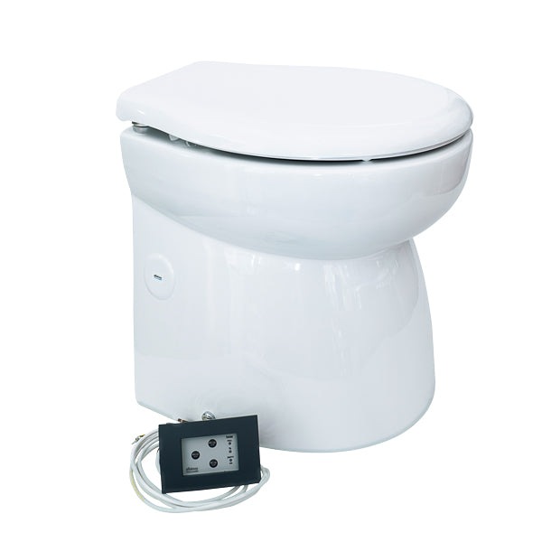 Tystspolande eltoalett. Levereras med 3-funktions panel som reglerar spolningen. \n\nSolenoidventil (art nr 1580819) eller separat spolpump (Art 1580806 12V) ingår inte.\nSolenoid lösningen används när man vill använda båtens befintliga tryckvattensystem då spolning med sötvatten minimerar risken för dålig lukt.\n\nVälj mellan standard höjd och Low\n\n \n