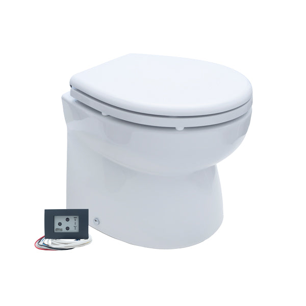 Tystspolande eltoalett. Levereras med 3-funktions panel som reglerar spolningen. \n\nSolenoidventil (art nr 1580819) eller separat spolpump (Art 1580806 12V) ingår inte.\nSolenoid lösningen används när man vill använda båtens befintliga tryckvattensystem då spolning med sötvatten minimerar risken för dålig lukt.\n\nVälj mellan standard höjd och Low\n\n