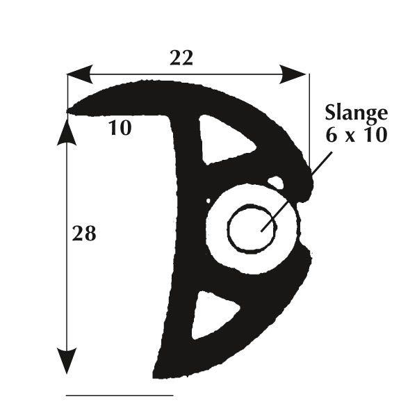 Svart PVC-fenderlist med läpp i storlek 25 x 12/22 mm. Kan användas med inläggsslang 6x10 mm, som finns i svart ogc vit.